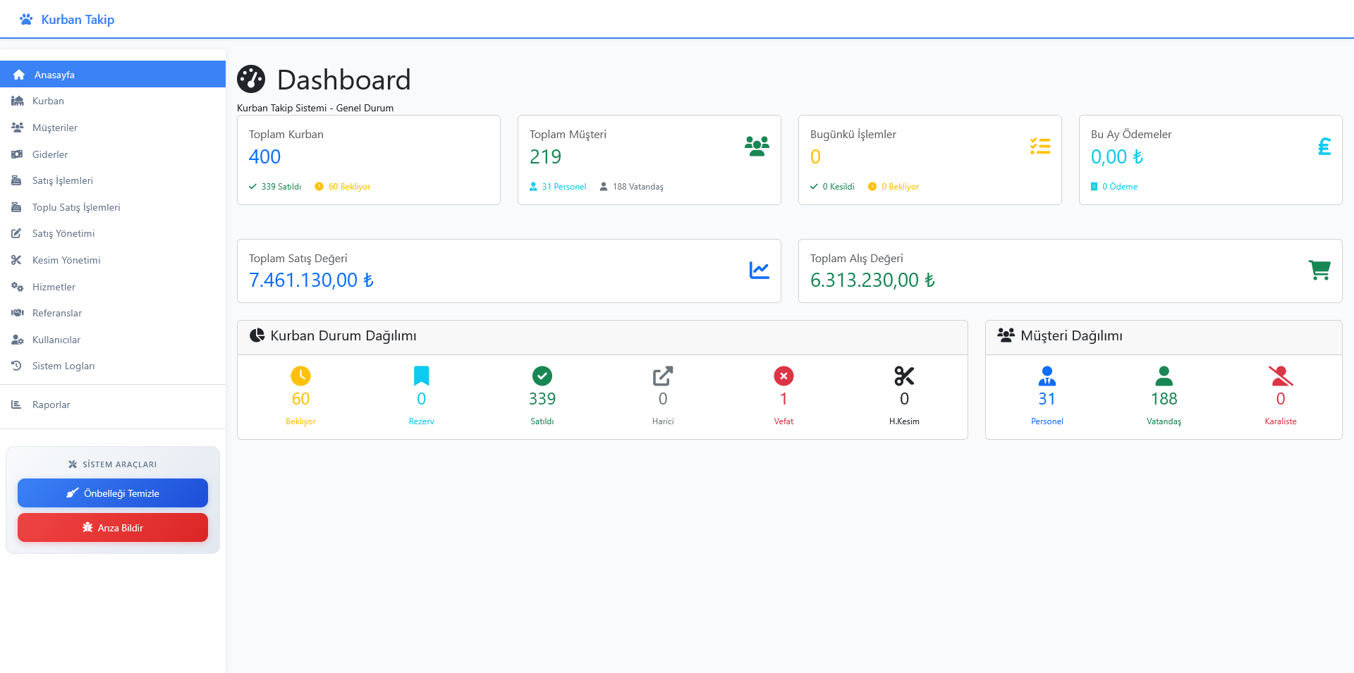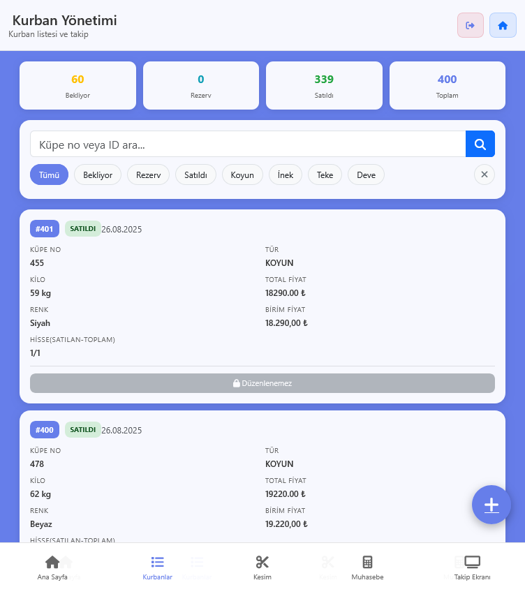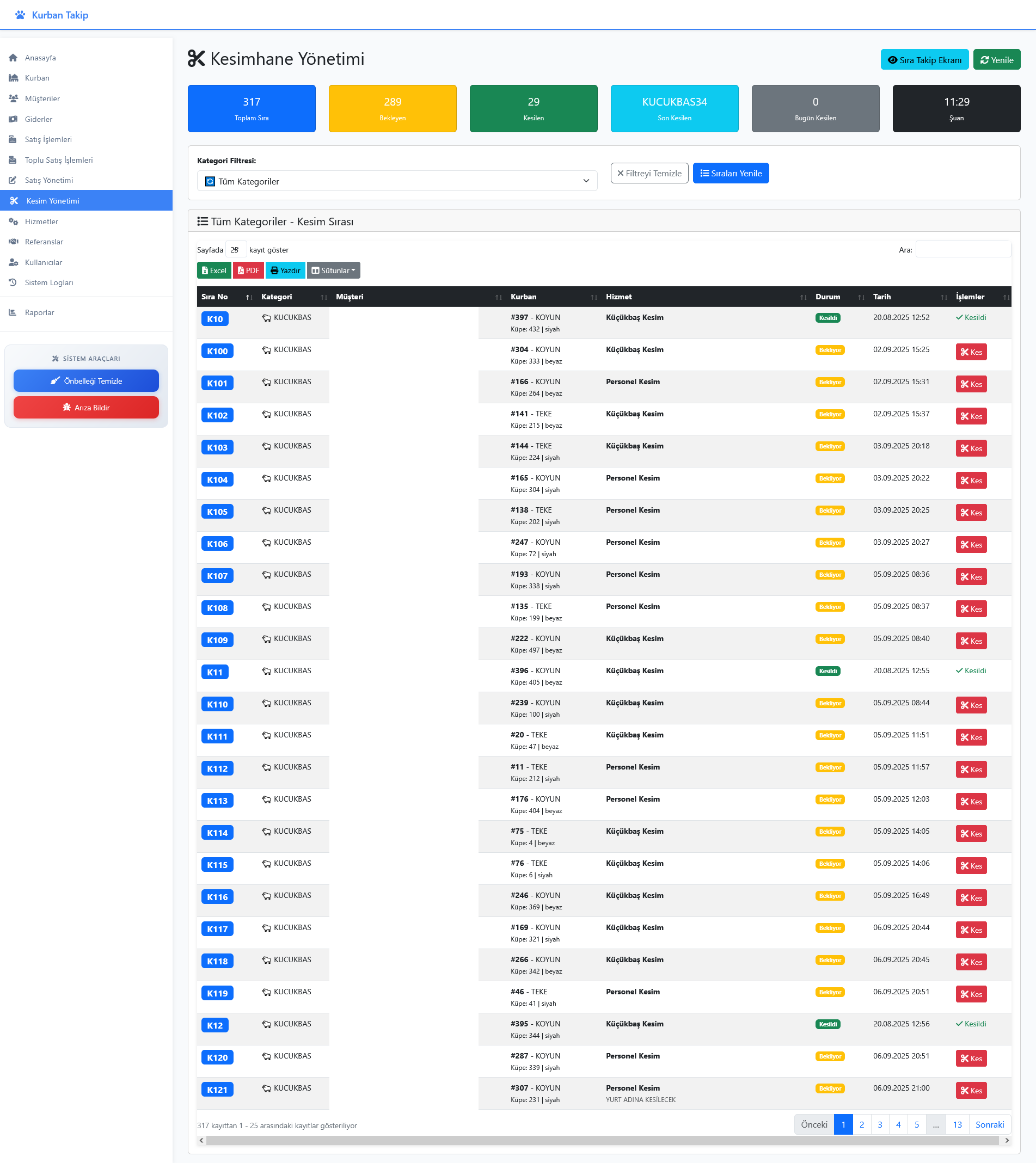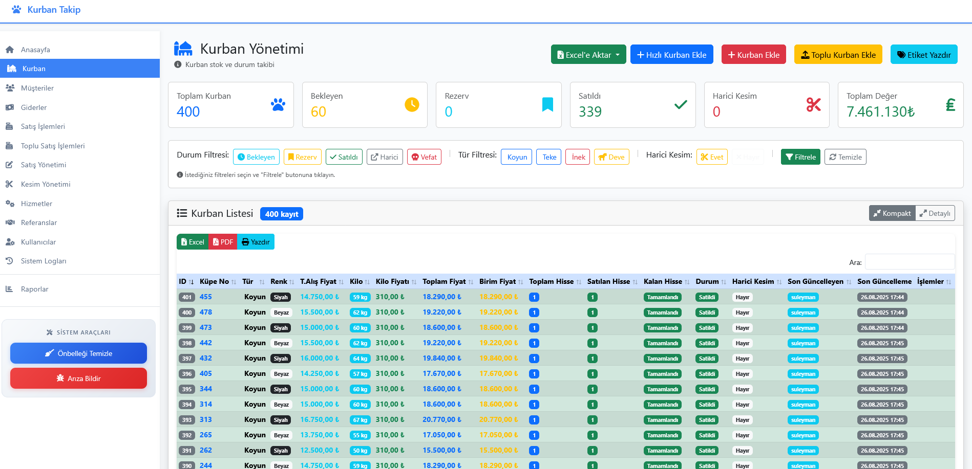 Tüm kurbanlarınızı tek platformda yönetin, stok kontrolü sağlayın.